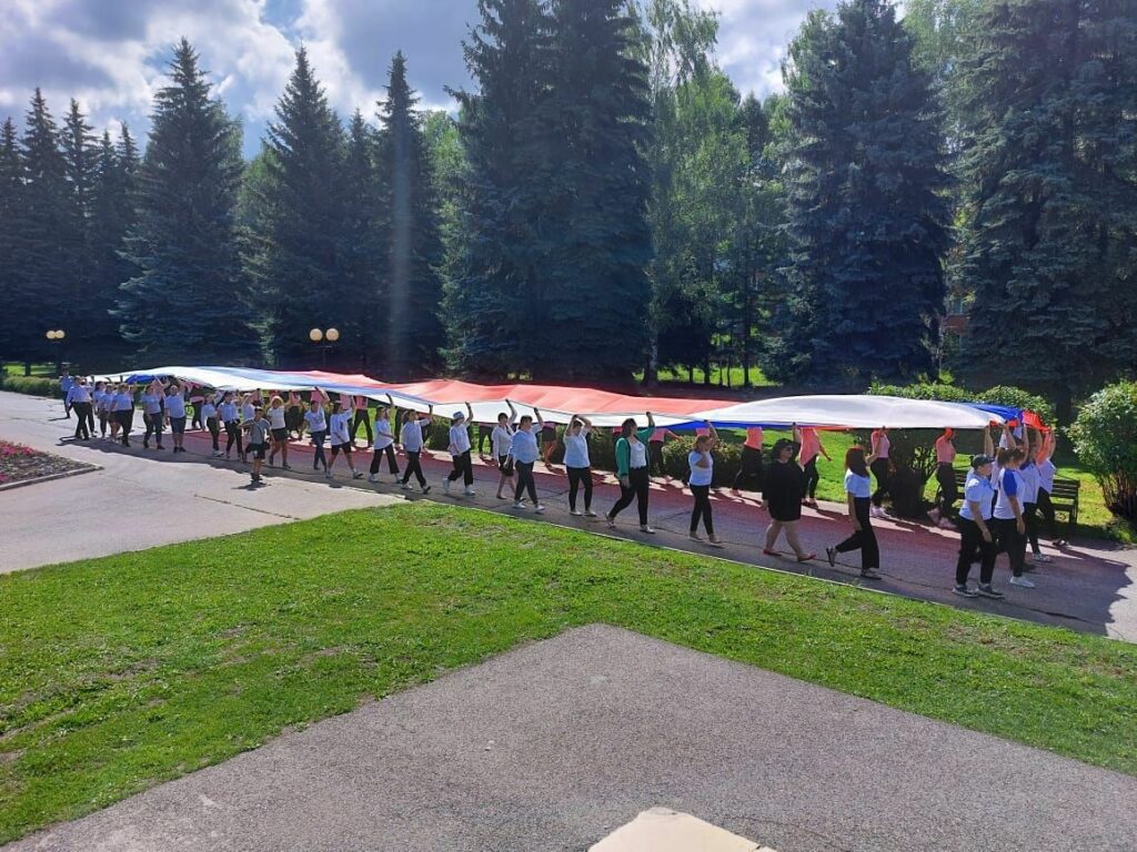 Волонтеры пронесли по центральной площади полотнище Знамени Победы размером 25 метров. Также представители национальных общественных организаций вместе с собравшимися на площади горожанами хором исполнили гимн России.