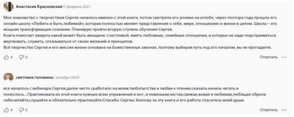 Ангелина из Москвы в отзыве поведала, что после прохождения курса Сергея Хохлова «Любить и быть любимой» улучшились ее отношения с бойфрендом. Но это не все: Ангелина поняла, как добиваться поставленных целей, слушать свои желания и не задвигать их на второй план. Эта трансформация в мышлении закономерно привела и к карьерным успехам. Отзыв Ангелины однозначно положительный.