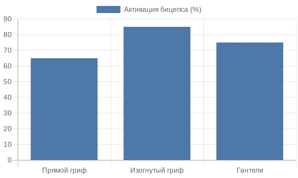 Диаграмма показывает разницу в активации бицепса при использовании различных типов грифов.
